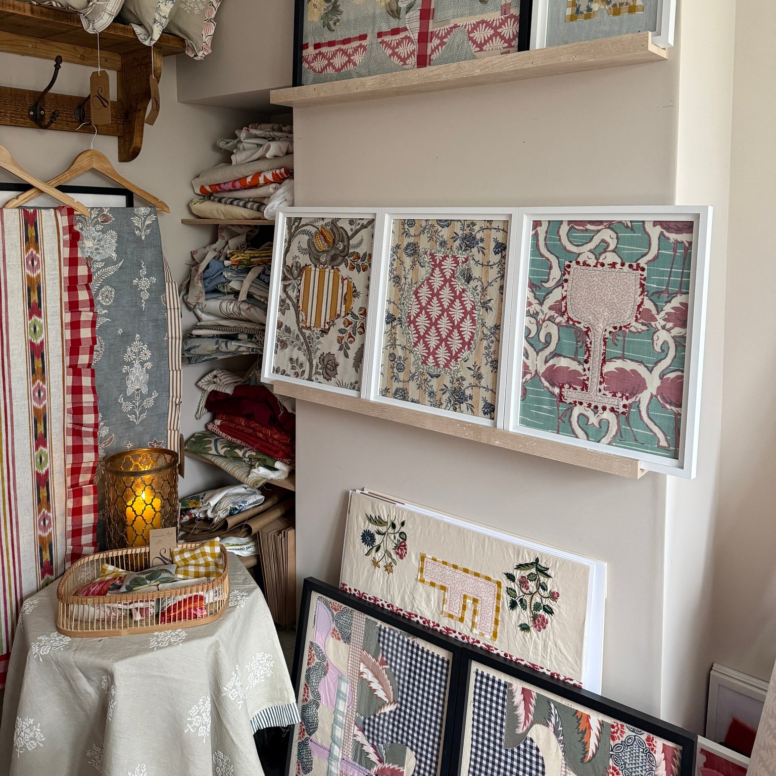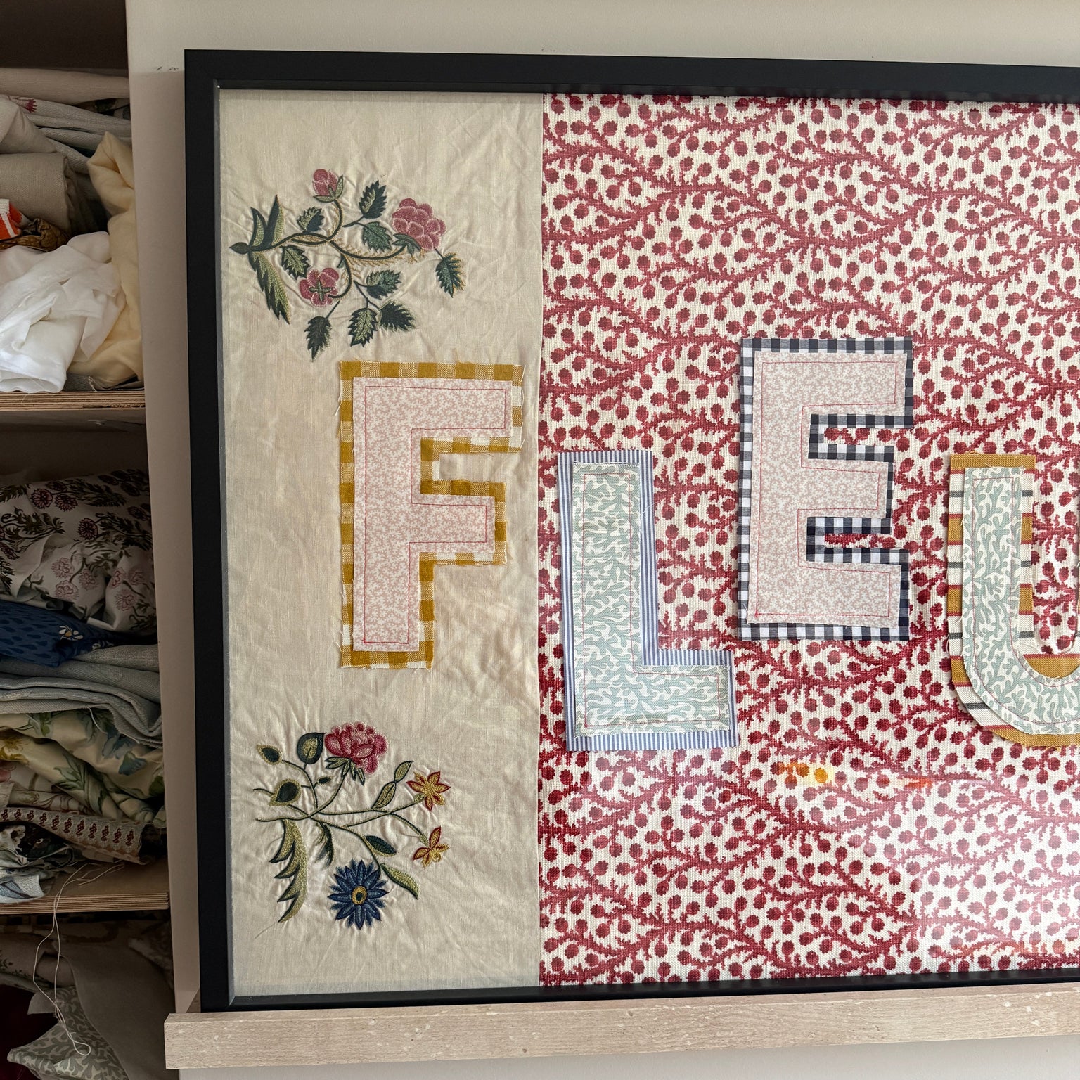 Contemporary wall art made from remnant textiles.
